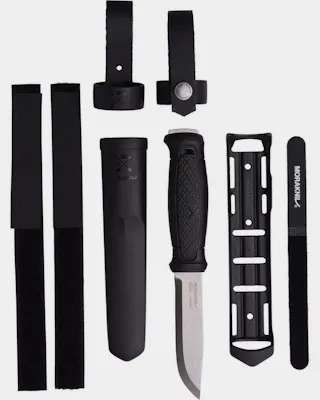 Morakniv offers a bushcraft knife made from high-carbon steel, with a sharp spine designed for use with fire starters. It features a grippy rubber handle. Check also the Morakniv Garber Multi-mount Set.